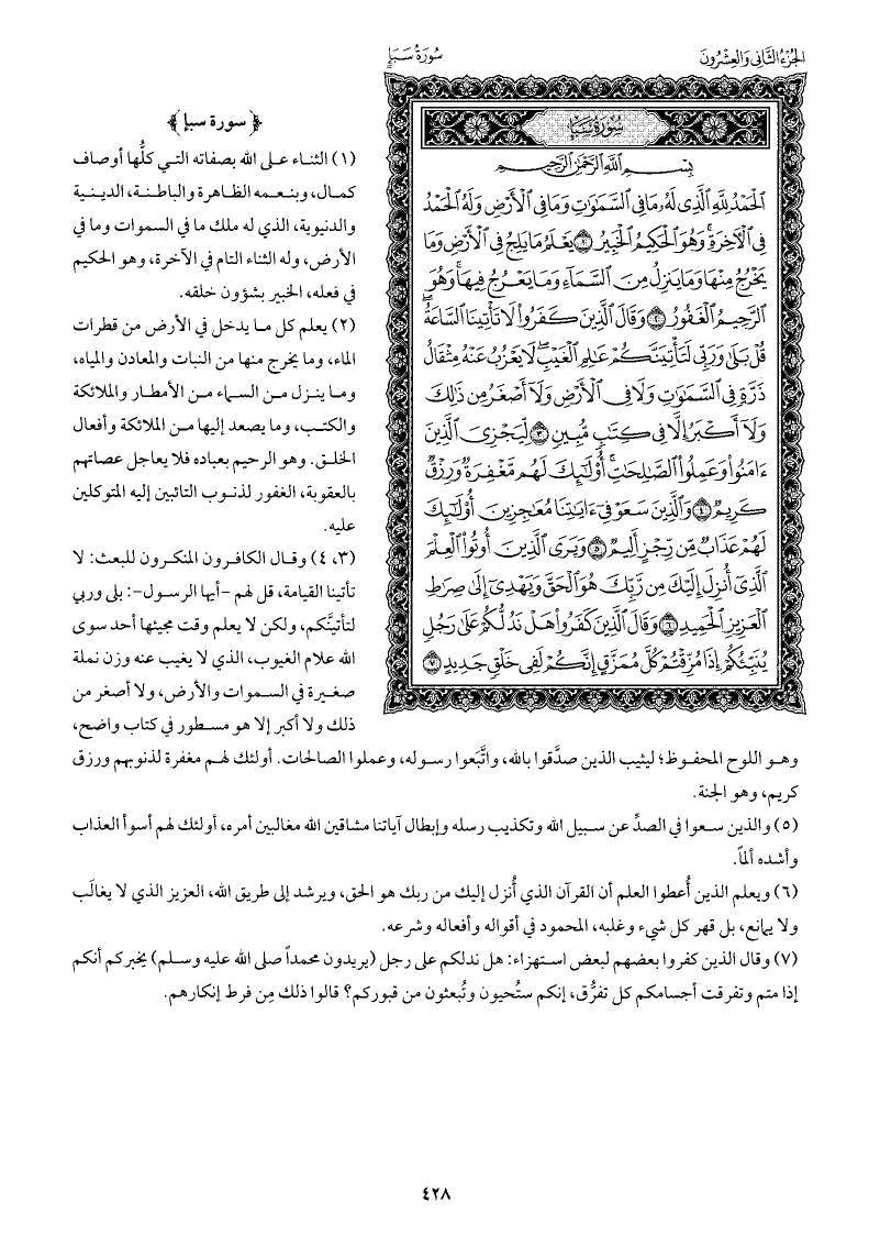 وقال الكافرون المنكرون للبعث: لا تأتينا القيامة، قل لهم -أيها الرسول-: بلى وربي لتأتينَّكم، ولكن لا يعلم وقت مجيئها أحد سوى الله علام الغيوب، الذي لا يغيب عنه وزن نملة صغيرة في السموات والأرض، ولا أصغر من ذلك ولا أكبر إلا هو مسطور في كتاب واضح، وهو اللوح المحفوظ; ليثيب الذين صدَّقوا بالله، واتَّبَعوا رسوله، وعملوا الصالحات. أولئك لهم مغفرة لذنوبهم ورزق كريم، وهو الجنة.