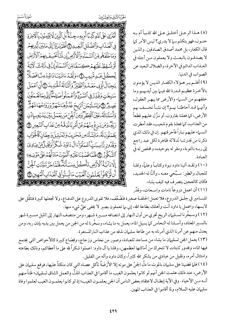 هذا الرجل أختلق على الله كذبًا أم به جنون، فهو يتكلم بما لا يدري؟ ليس الأمر كما قال الكفار، بل محمد أصدق الصادقين. والذين لا يصدقون بالبعث ولا يعملون من أجله في العذاب الدائم في الآخرة، والضلال البعيد عن الصواب في الدنيا.