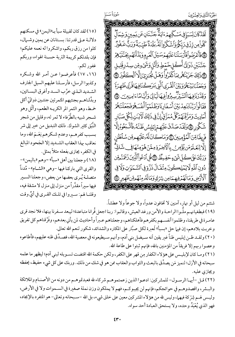 لقد كان لقبيلة سبأ بـ «اليمن» في مسكنهم دلالة على قدرتنا: بستانان عن يمين وشمال، كلوا من رزق ربكم، واشكروا له نعمه عليكم; فإن بلدتكم كريمة التربة حسنة الهواء، وربكم غفور لكم.