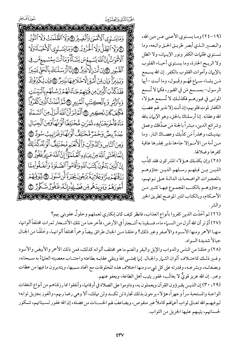 وما يستوي الأعمى عن دين الله، والبصير الذي أبصر طريق الحق واتبعه، وما تستوي ظلمات الكفر ونور الإيمان، ولا الظل ولا الريح الحارة، وما يستوي أحياء القلوب بالإيمان، وأموات القلوب بالكفر. إن الله يسمع مَن يشاء سماع فَهْم وقَبول، وما أنت -أيها الرسول- بمسمع مَن في القبور، فكما لا تُسمع الموتى في قبورهم فكذلك لا تُسمع هؤلاء الكفار لموت قلوبهم، إن أنت إلا نذير لهم غضب الله وعقابه. إنا أرسلناك بالحق، وهو الإيمان بالله وشرائع الدين، مبشرًا بالجنة مَن صدَّقك وعمل بهديك، ومحذرًا مَن كذَّبك وعصاك النار. وما من أمة من الأمم إلا جاءها نذير يحذرها عاقبة كفرها وضلالها.