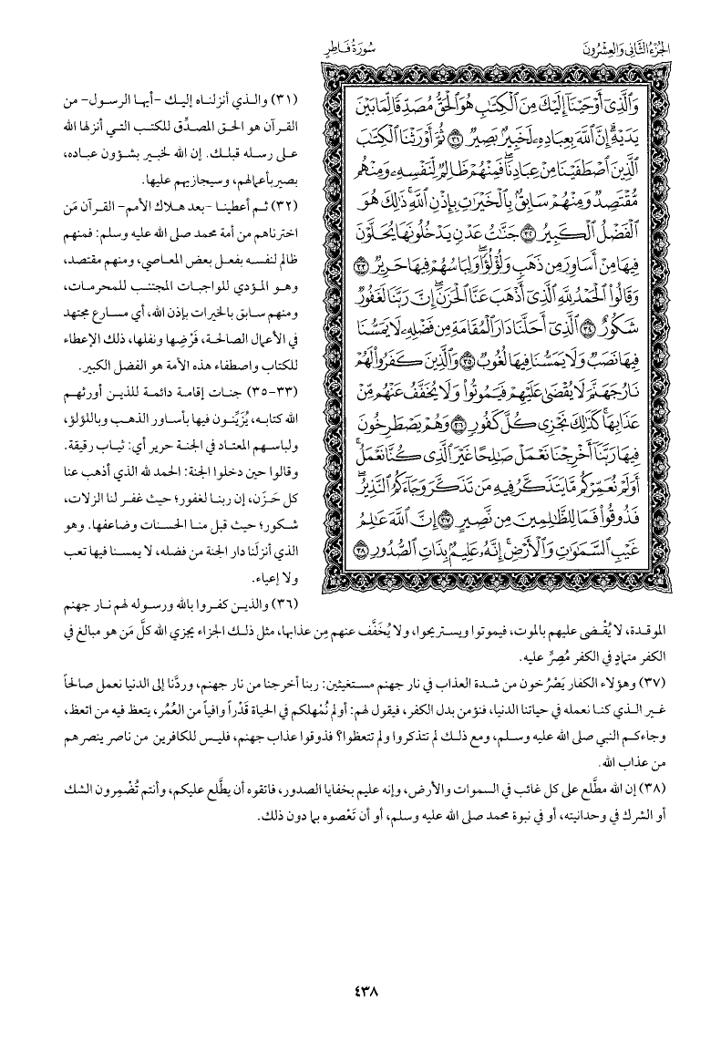 جنات إقامة دائمة للذين أورثهم الله كتابه يُحلَّون فيها بأساور الذهب وباللؤلؤ، ولباسهم المعتاد في الجنة حرير أي: ثياب رقيقة. وقالوا حين دخلوا الجنة: الحمد لله الذي أذهب عنا كل حَزَن، إن ربنا لغفور; حيث غفر لنا الزلات، شكور; حيث قبل منا الحسنات وضاعفها. وهو الذي أنزلَنا دار الجنة من فضله، لا يمسنا فيها تعب ولا إعياء.