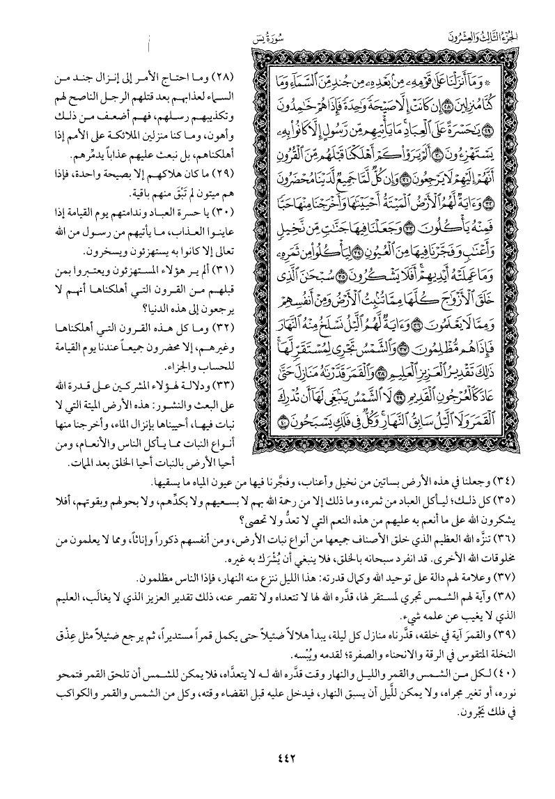 لكل من الشمس والقمر والليل والنهار وقت قدَّره الله له لا يتعدَّاه، فلا يمكن للشمس أن تلحق القمر فتمحو نوره، أو تغير مجراه، ولا يمكن للَّيل أن يسبق النهار، فيدخل عليه قبل انقضاء وقته، وكل من الشمس والقمر والكواكب في فلك يَجْرون.