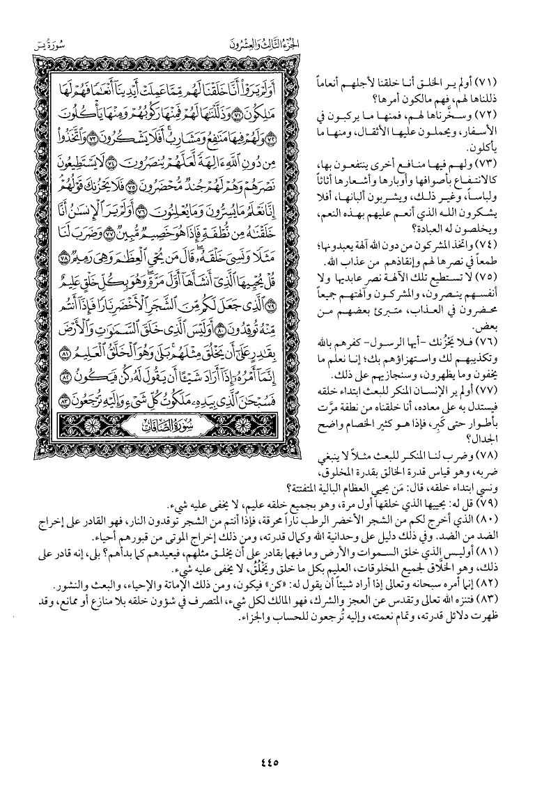 الذي أخرج لكم من الشجر الأخضر الرطب نارًا محرقة، فإذا أنتم من الشجر توقدون النار، فهو القادر على إخراج الضد من الضد. وفي ذلك دليل على وحدانية الله وكمال قدرته، ومن ذلك إخراج الموتى من قبورهم أحياء.