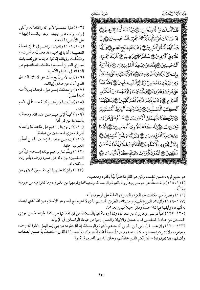 تحيةٌ لموسى وهارون من عند الله، وثناءٌ ودعاءٌ لهما بالسلامة من كل آفة، كما جزيناهما الجزاء الحسن نجزي المحسنين من عبادنا المخلصين لنا بالصدق والإيمان والعمل. إنهما من عبادنا الراسخين في الإيمان.
