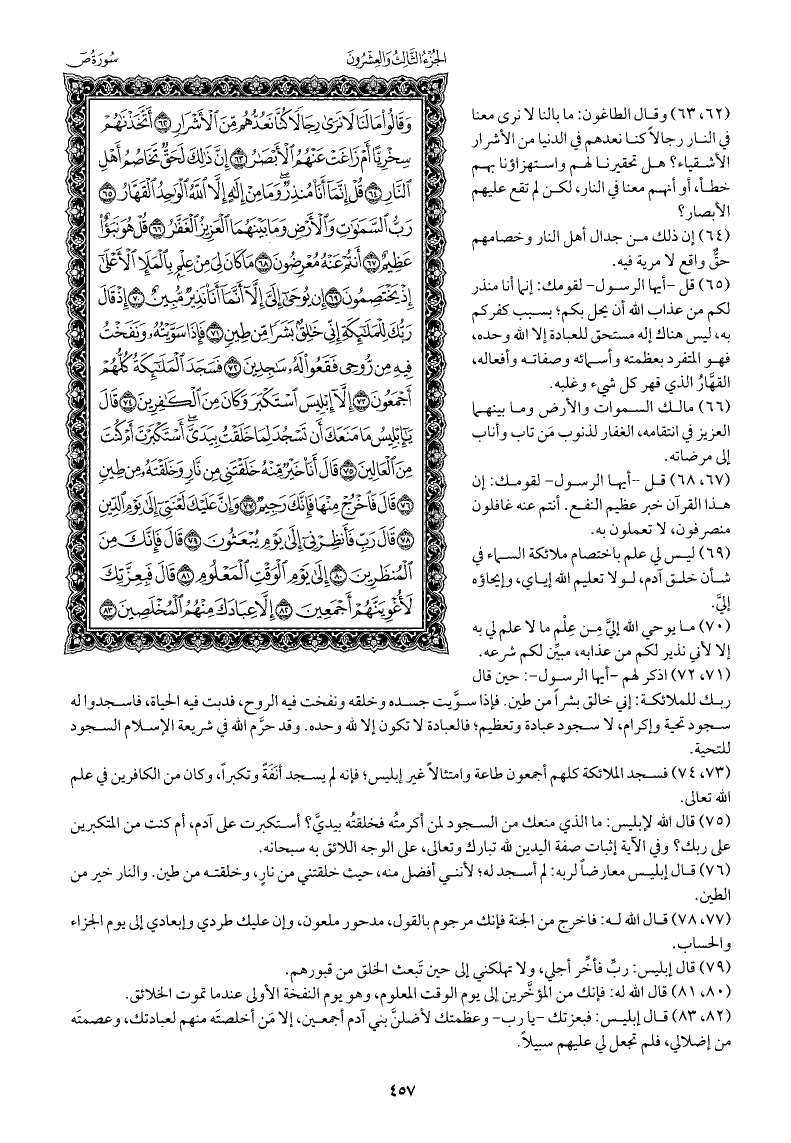 قال الله لإبليس: ما الذي منعك من السجود لمن أكرمتُه فخلقتُه بيديَّ؟ أستكبرت على آدم، أم كنت من المتكبرين على ربك؟ وفي الآية إثبات صفة اليدين لله تبارك وتعالى، على الوجه اللائق به سبحانه.