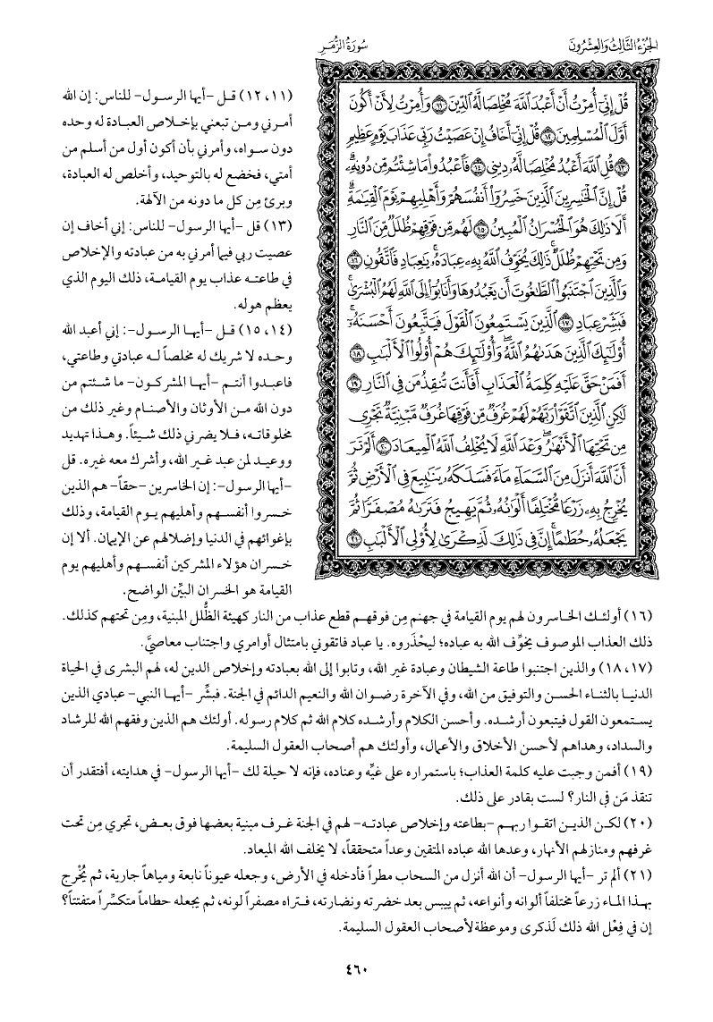 قل -أيها الرسول-: إني أعبد الله وحده لا شريك له مخلصًا له عبادتي وطاعتي، فاعبدوا أنتم -أيها المشركون- ما شئتم من دون الله من الأوثان والأصنام وغير ذلك من مخلوقاته، فلا يضرني ذلك شيئًا. وهذا تهديد ووعيد لمن عبد غير الله، وأشرك معه غيره. قل -أيها الرسول-: إن الخاسرين- حقًا- هم الذين خسروا أنفسهم وأهليهم يوم القيامة، وذلك بإغوائهم في الدنيا وإضلالهم عن الإيمان. ألا إن خسران هؤلاء المشركين أنفسهم وأهليهم يوم القيامة هو الخسران البيِّن الواضح.
