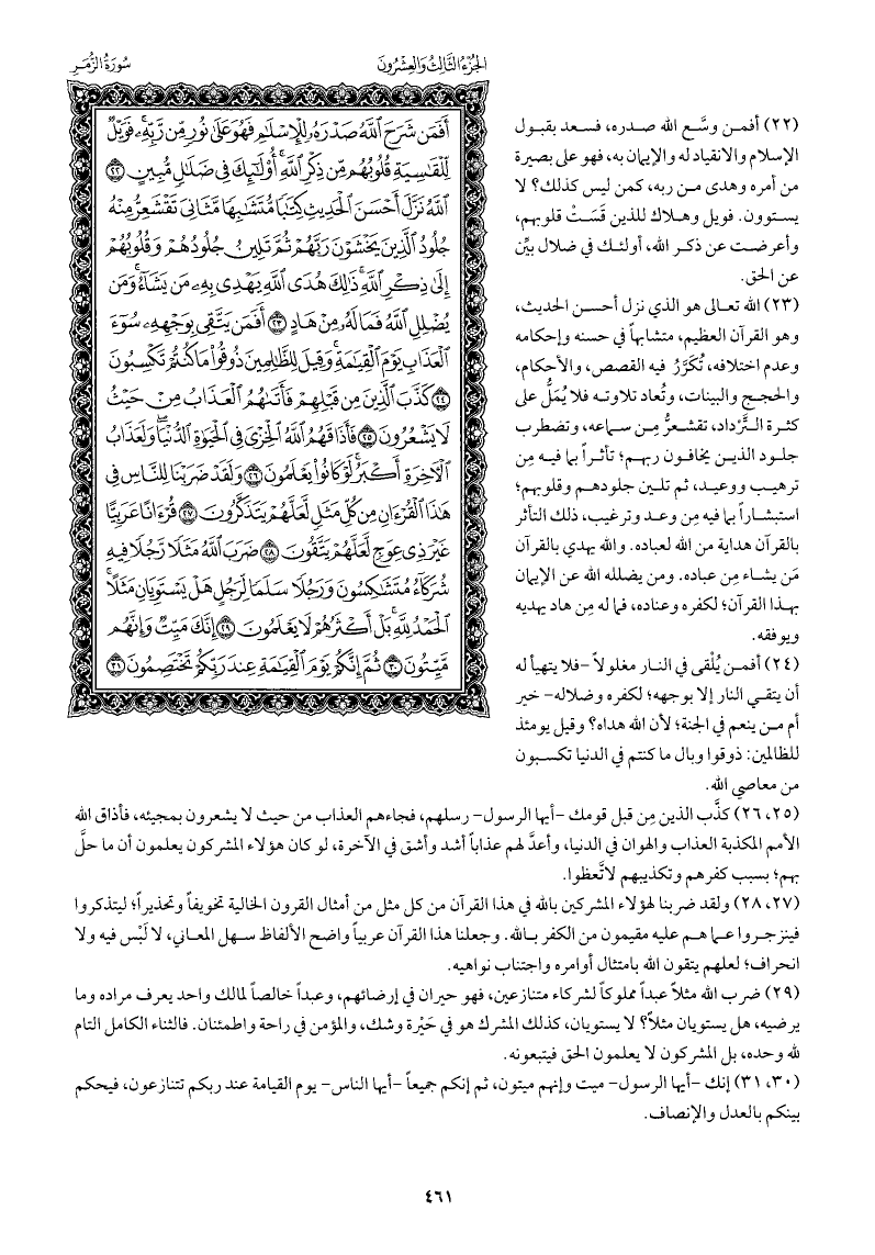 أفمن وسَّع الله صدره، فسعد بقبول الإسلام والانقياد له والإيمان به، فهو على بصيرة من أمره وهدى من ربه، كمن ليس كذلك؟ لا يستوون. فويل وهلاك للذين قَسَتْ قلوبهم، وأعرضت عن ذكر الله، أولئك في ضلال بيِّن عن الحق.