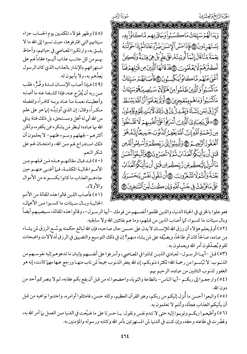 قل -أيها الرسول- لعبادي الذين تمادَوا في المعاصي، وأسرفوا على أنفسهم بإتيان ما تدعوهم إليه نفوسهم من الذنوب: لا تَيْئسوا من رحمة الله؛ لكثرة ذنوبكم، إن الله يغفر الذنوب جميعًا لمن تاب منها ورجع عنها مهما كانت، إنه هو الغفور لذنوب التائبين من عباده، الرحيم بهم.