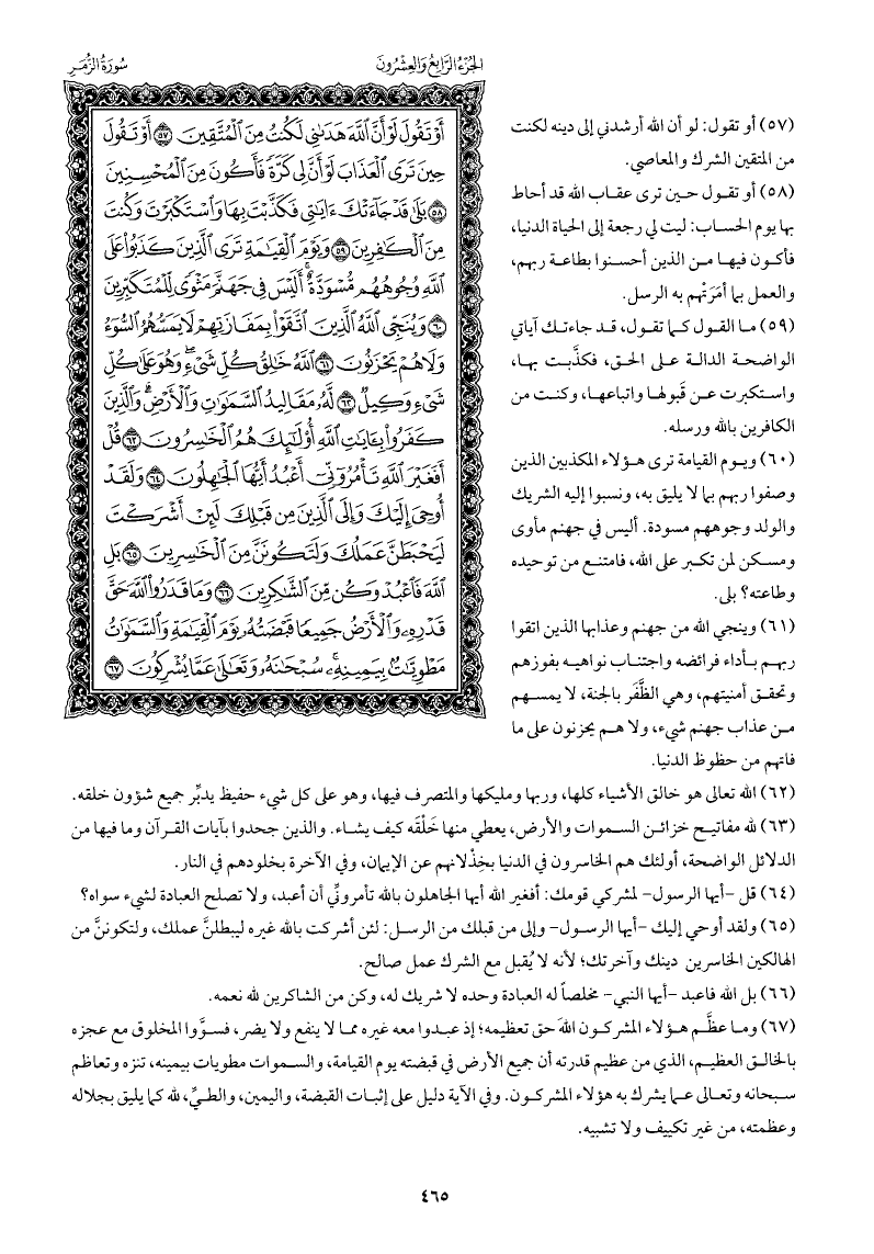 وما عظَّم هؤلاء المشركون اللهَ حق تعظيمه; إذ عبدوا معه غيره مما لا ينفع ولا يضر، فسوَّوا المخلوق مع عجزه بالخالق العظيم، الذي من عظيم قدرته أن جميع الأرض في قبضته يوم القيامة، والسموات مطويات بيمينه، تنزه وتعاظم سبحانه وتعالى عما يشرك به هؤلاء المشركون، وفي الآية دليل على إثبات القبضة، واليمين، والطيِّ، لله كما يليق بجلاله وعظمته، من غير تكييف ولا تشبيه.