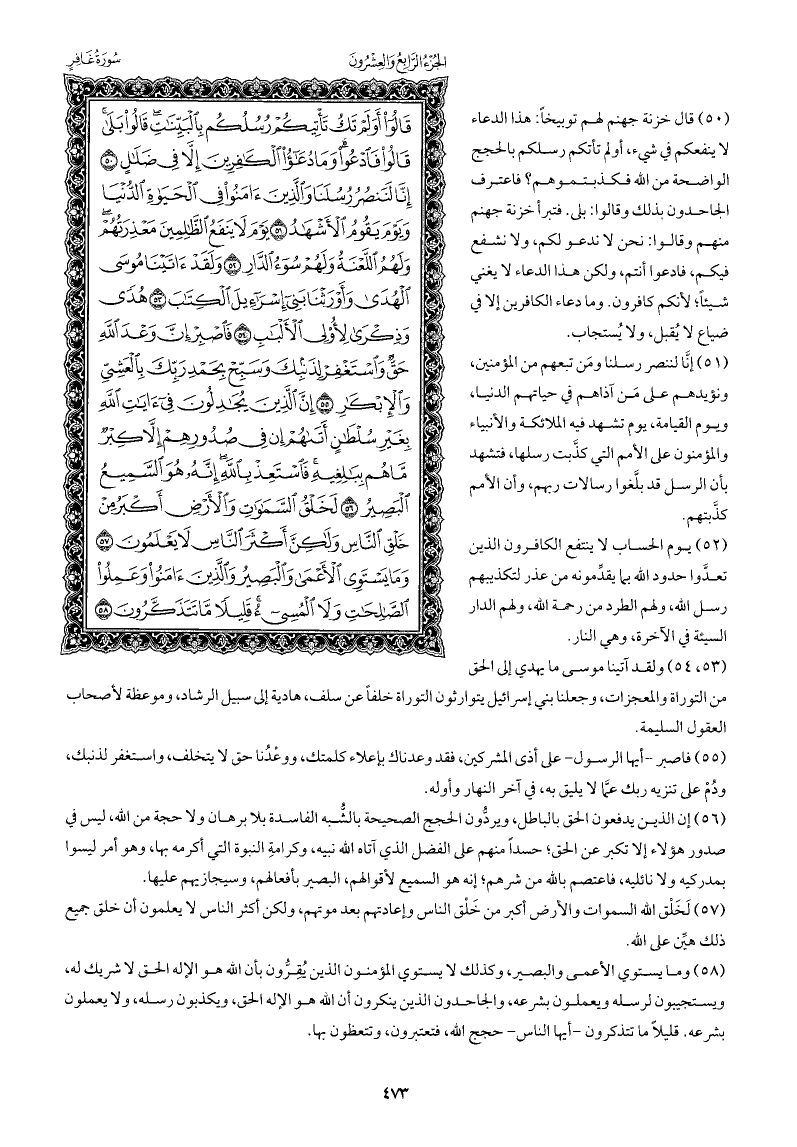قال خزنة جهنم لهم توبيخًا: هذا الدعاء لا ينفعكم في شيء، أو لم تأتكم رسلكم بالحجج الواضحة من الله فكذبتموهم؟ فاعترف الجاحدون بذلك وقالوا: بلى. فتبرأ خزنة جهنم منهم وقالوا: نحن لا ندعو لكم، ولا نشفع فيكم، فادعوا أنتم، ولكن هذا الدعاء لا يغني شيئًا؛ لأنكم كافرون. وما دعاء الكافرين إلا في ضياع لا يُقبل، ولا يُستجاب.