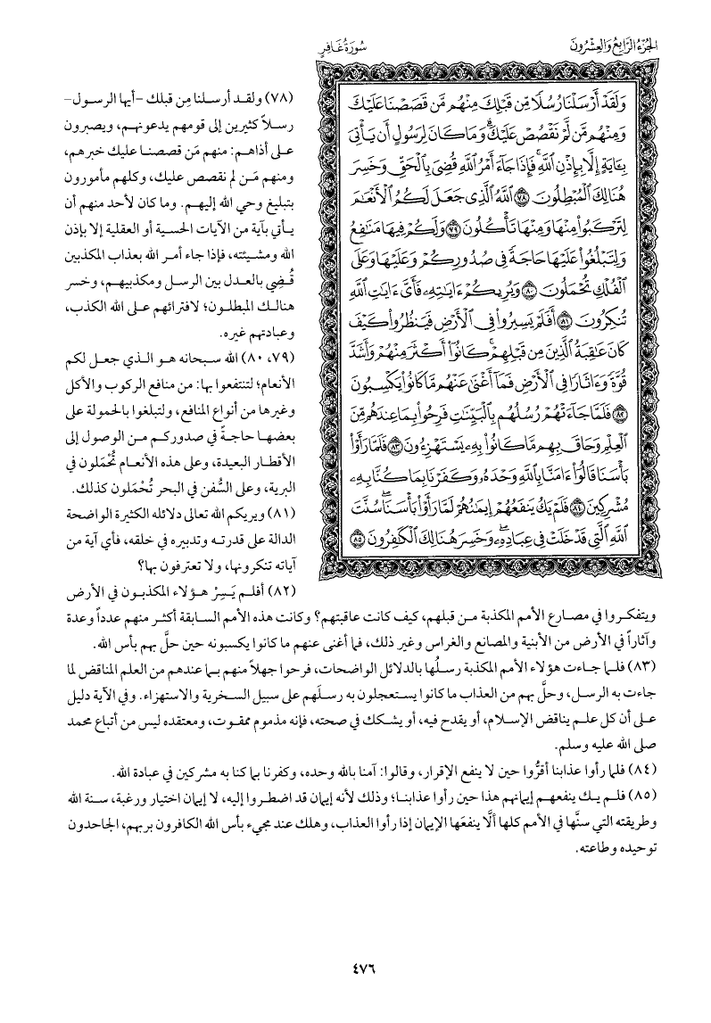 ولقد أرسلنا مِن قبلك -أيها الرسول- رسلا كثيرين إلى قومهم يدعونهم، ويصبرون على أذاهم: منهم مَن قصصنا عليك خبرهم، ومنهم مَن لم نقصص عليك، وكلهم مأمورون بتبليغ وحي الله إليهم. وما كان لأحد منهم أن يأتي بآية من الآيات الحسية أو العقلية إلا بإذن الله ومشيئته، فإذا جاء أمر الله بعذاب المكذبين قُضِي بالعدل بين الرسل ومكذبيهم، وخسر هنالك المبطلون؛ لافترائهم على الله الكذب، وعبادتهم غيره.