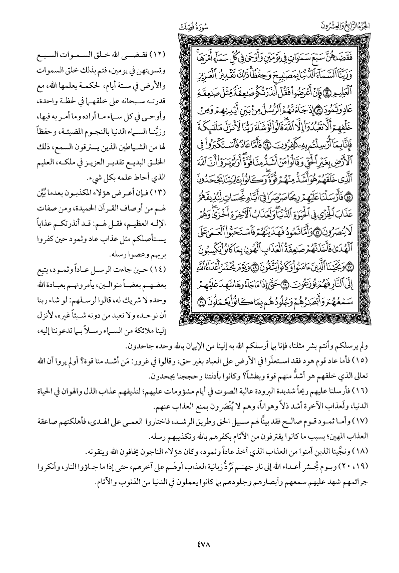 فقضى الله خلق السماوات السبع وتسويتهن في يومين، فتم بذلك خلق السماوات والأرض في ستة أيام، لحكمة يعلمها الله، مع قدرته سبحانه على خلقهما في لحظة واحدة، وأوحى في كل سماء ما أراده وما أمر به فيها، وزيَّنا السماء الدنيا بالنجوم المضيئة، وحفظًا لها من الشياطين الذين يسترقون السمع، ذلك الخلق البديع تقدير العزيز في ملكه، العليم الذي أحاط علمه بكل شيء.