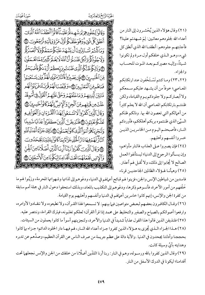 هذا الجزاء الذي يُجزى به هؤلاء الذين كفروا جزاء أعداء الله النار، لهم فيها دار الخلود الدائم؛ جزاء بما كانوا بحججنا وأدلتنا يجحدون في الدنيا. والآية دالة على عظم جريمة من صرف الناس عن القرآن العظيم، وصدهم عن تدبره وهدايته بأيِّ وسيلة كانت.