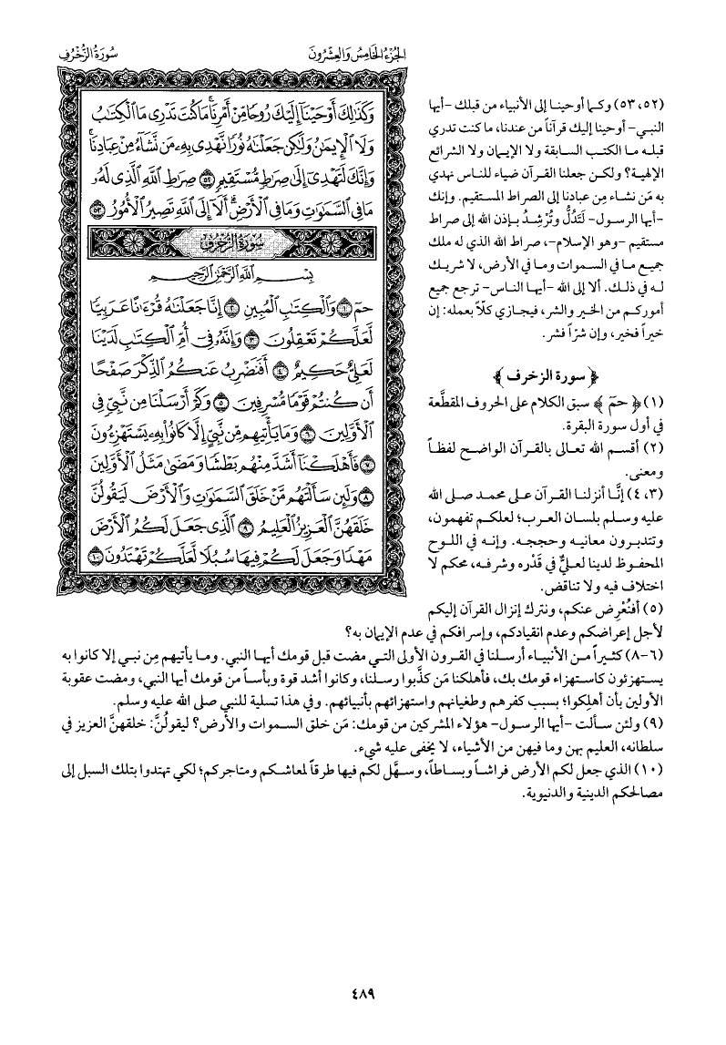 إنَّا أنزلنا القرآن على محمد صلى الله عليه وسلم بلسان العرب؛ لعلكم تفهمون، وتتدبرون معانيه وحججه. وإنه في اللوح المحفوظ لدينا لعليٌّ في قَدْره وشرفه، محكم لا اختلاف فيه ولا تناقض.