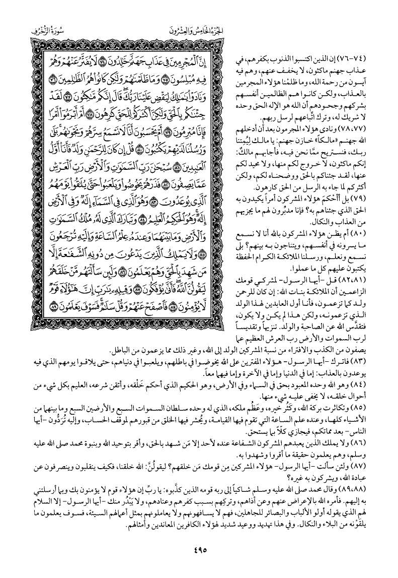 وقال محمد صلى الله عليه وسلم شاكيًا إلى ربه قومه الذين كذَّبوه: يا ربِّ إن هؤلاء قوم لا يؤمنون بك وبما أرسلتني به إليهم. فأمره الله بالإعراض عنهم وعن أذاهم، وتركهم بسبب كفرهم وعنادهم، ولا يَبْدُر منك -أيها الرسول- إلا السلام لهم الذي يقوله أولو الألباب والبصائر للجاهلين، فهم لا يسافهونهم ولا يعاملونهم بمثل أعمالهم السيئة، فسوف يعلمون ما يلقَوْنه من البلاء والنكال. وفي هذا تهديد ووعيد شديد لهؤلاء الكافرين المعاندين وأمثالهم.