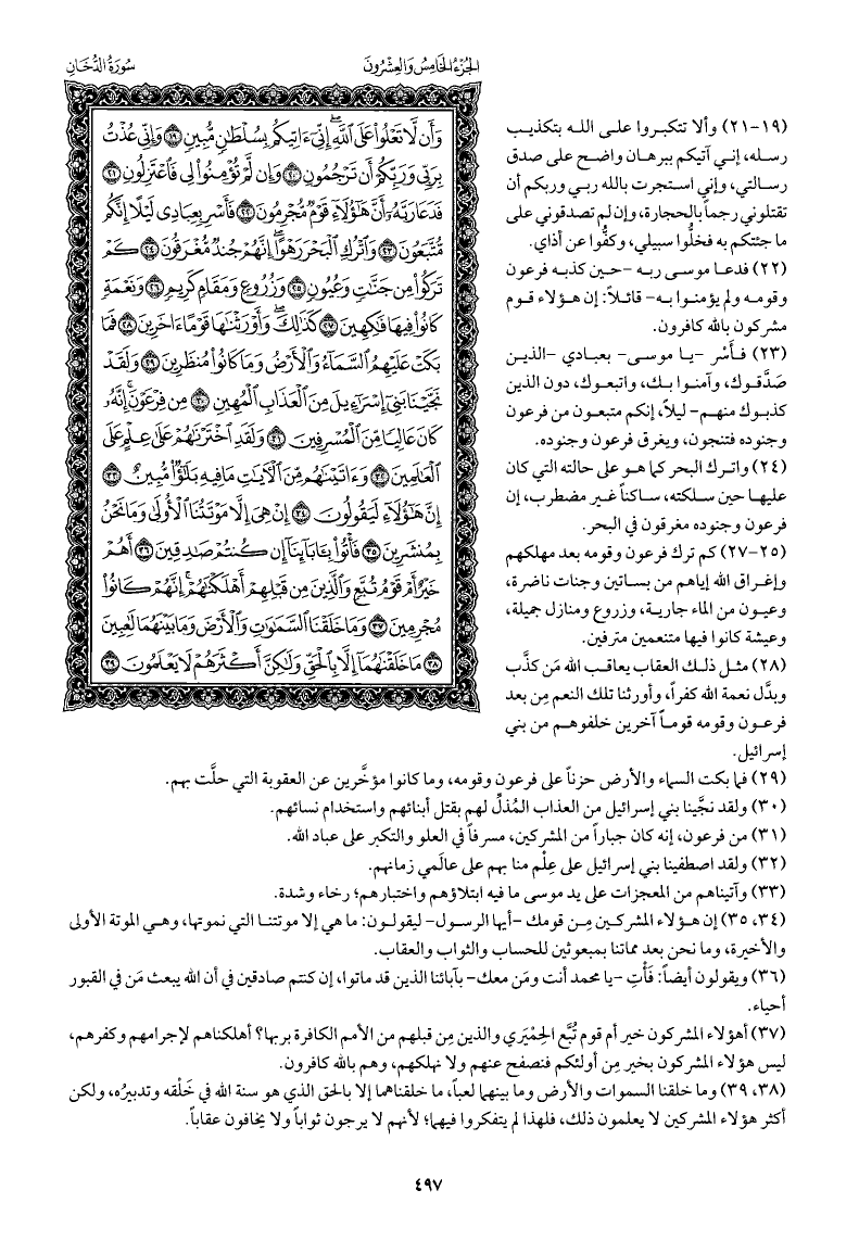 وألا تتكبروا على الله بتكذيب رسله، إني آتيكم ببرهان واضح على صدق رسالتي، وإني استجرت بالله ربي وربكم أن تقتلوني رجمًا بالحجارة، وإن لم تصدقوني على ما جئتكم به فخلُّوا سبيلي، وكفُّوا عن أذاي.