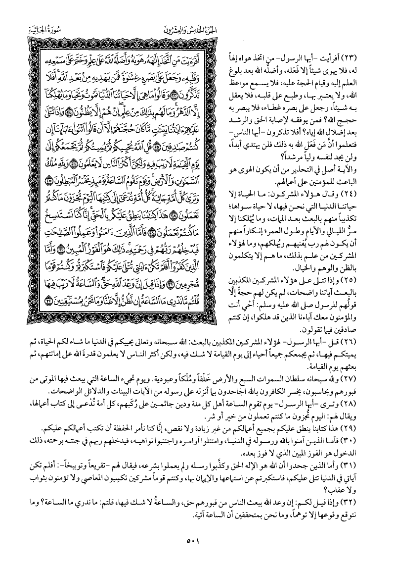 أفرأيت -أيها الرسول- من اتخذ هواه إلهًا له، فلا يهوى شيئًا إلا فَعَله، وأضلَّه الله بعد بلوغ العلم إليه وقيام الحجة عليه، فلا يسمع مواعظ الله، ولا يعتبر بها، وطبع على قلبه، فلا يعقل به شيئًا، وجعل على بصره غطاء، فلا يبصر به حجج الله؟ فمن يوفقه لإصابة الحق والرشد بعد إضلال الله إياه؟ أفلا تذكرون -أيها الناس- فتعلموا أنَّ مَن فَعَل الله به ذلك فلن يهتدي أبدًا، ولن يجد لنفسه وليًا مرشدًا؟