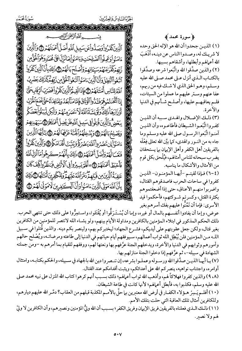 فإذا لقيتم -أيها المؤمنون- الذين كفروا في ساحات الحرب فاصدقوهم القتال، واضربوا منهم الأعناق، حتى إذا أضعفتموهم بكثرة القتل، وكسرتم شوكتهم، فأحكموا قيد الأسرى: فإما أن تَمُنُّوا عليهم بفك أسرهم بغير عوض، وإما أن يفادوا أنفسهم بالمال أو غيره، وإما أن يُسْتَرَقُّوا أو يُقْتَلوا، واستمِرُّوا على ذلك حتى تنتهي الحرب. ذلك الحكم المذكور في ابتلاء المؤمنين بالكافرين ومداولة الأيام بينهم، ولو يشاء الله لانتصر للمؤمنين من الكافرين بغير قتال، ولكن جعل عقوبتهم على أيديكم، فشرع الجهاد؛ ليختبركم بهم، ولينصر بكم دينه. والذين قُتلوا في سبيل الله من المؤمنين فلن يُبْطِل الله ثواب أعمالهم، سيوفقهم أيام حياتهم في الدنيا إلى طاعته ومرضاته، ويُصْلح حالهم وأمورهم وثوابهم في الدنيا والآخرة، ويدخلهم الجنة، عرَّفهم بها ونعتها لهم، ووفقهم للقيام بما أمرهم به -ومن جملته الشهادة في سبيله-، ثم عرَّفهم إذا دخلوا الجنة منازلهم بها.