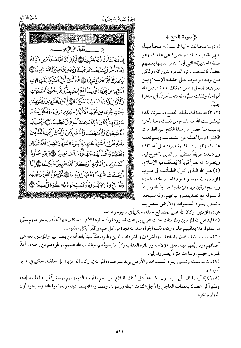 إنا فتحنا لك -أيها الرسول- فتحًا مبينًا، يظهر الله فيه دينك، وينصرك على عدوك، وهو هدنة «الحديبية» التي أمن الناس بسببها بعضهم بعضًا، فاتسعت دائرة الدعوة لدين الله، وتمكن من يريد الوقوف على حقيقة الإسلام مِن معرفته، فدخل الناس تلك المدة في دين الله أفواجًا؛ ولذلك سمَّاه الله فتحًا مبينًا، أي ظاهرًا جليًّا.