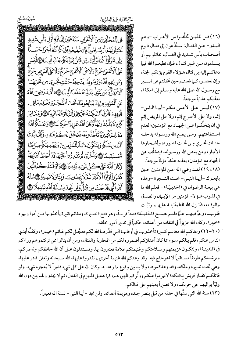 قل للذين تخلَّفوا من الأعراب -وهم البدو- عن القتال: ستُدْعون إلى قتال قوم أصحاب بأس شديد في القتال، تقاتلونهم أو يسلمون من غير قتال، فإن تطيعوا الله فيما دعاكم إليه مِن قتال هؤلاء القوم يؤتكم الجنة، وإن تعصوه كما فعلتم حين تخلفتم عن السير مع رسول الله صلى الله عليه وسلم إلى «مكة» ، يعذبكم عذابًا موجعًا.