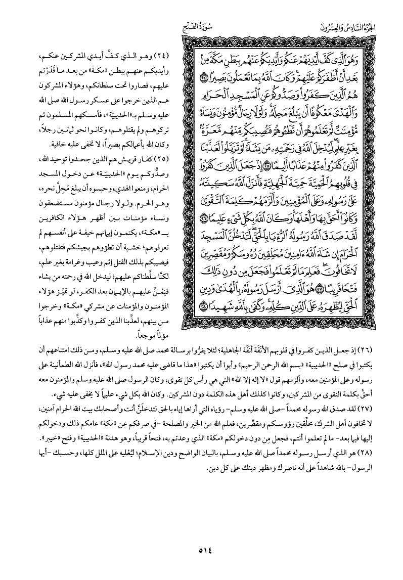 كفار قريش هم الذين جحدوا توحيد الله، وصدُّوكم يوم «الحديبية» عن دخول المسجد الحرام، ومنعوا الهدي، وحبسوه أن يبلغ محل نحره، وهو الحرم. ولولا رجال مؤمنون مستضعفون ونساء مؤمنات بين أظهر هؤلاء الكافرين بـ «مكة» ، يكتمون إيمانهم خيفة على أنفسهم لم تعرفوهم؛ خشية أن تطؤوهم بجيشكم فتقتلوهم، فيصيبكم بذلك القتل إثم وعيب وغرامة بغير علم، لكنَّا سلَّطناكم عليهم؛ ليدخل الله في رحمته من يشاء فيَمُنَّ عليهم بالإيمان بعد الكفر، لو تميَّز هؤلاء المؤمنون والمؤمنات عن مشركي «مكة» وخرجوا من بينهم، لعذَّبنا الذين كفروا وكذَّبوا منهم عذابًا مؤلمًا موجعًا.