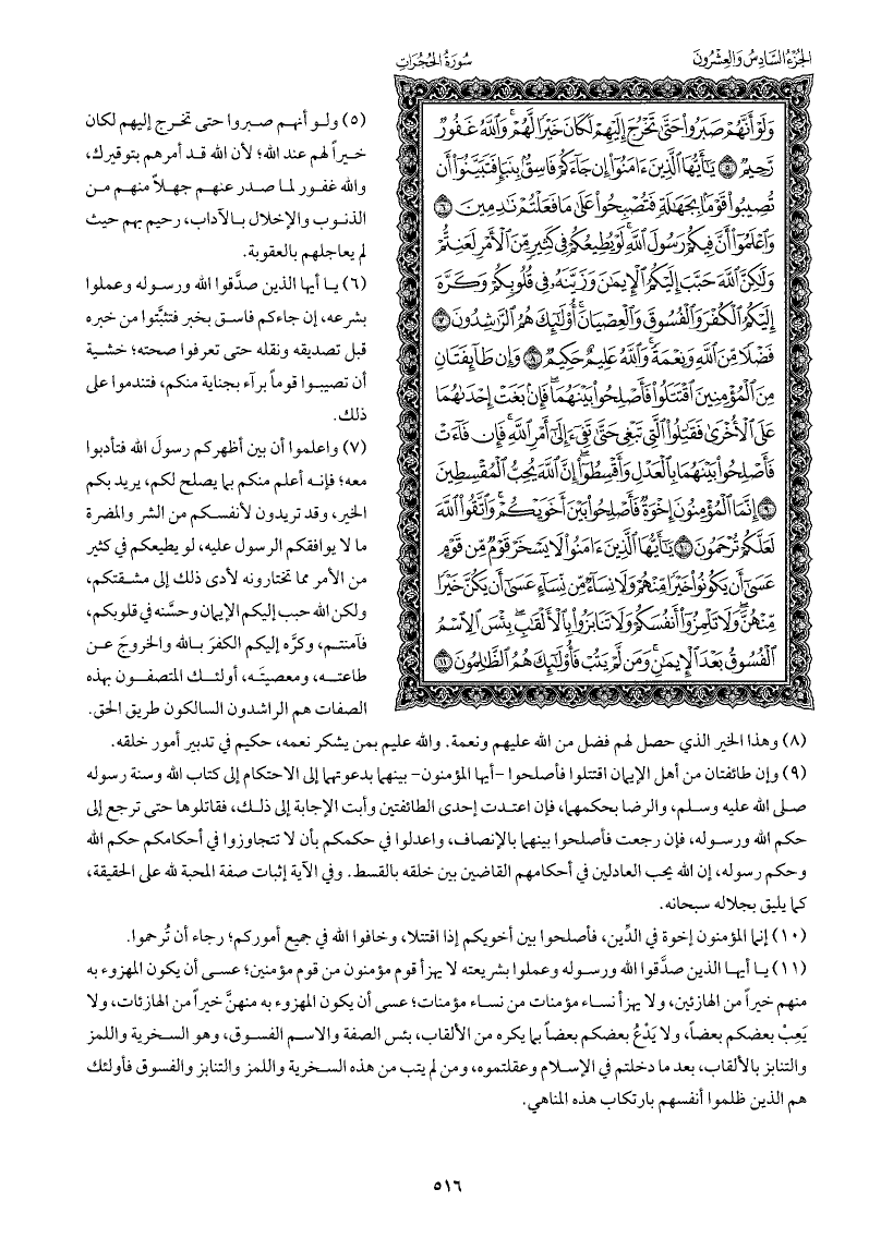 يا أيها الذين صدَّقوا الله ورسوله وعملوا بشريعته لا يهزأ قوم مؤمنون من قوم مؤمنين؛ عسى أن يكون المهزوء به منهم خيرًا من الهازئين، ولا يهزأ نساء مؤمنات من نساء مؤمنات; عسى أن يكون المهزوء به منهنَّ خيرًا من الهازئات، ولا يَعِبْ بعضكم بعضًا، ولا يَدْعُ بعضكم بعضًا بما يكره من الألقاب، بئس الصفة والاسم الفسوق، وهو السخرية واللمز والتنابز بالألقاب، بعد ما دخلتم في الإسلام وعقلتموه، ومن لم يتب من هذه السخرية واللمز والتنابز والفسوق فأولئك هم الذين ظلموا أنفسهم بارتكاب هذه المناهي.