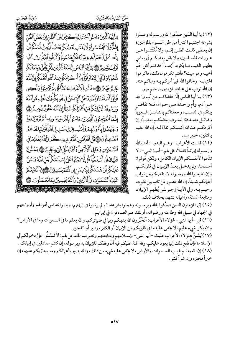 يا أيها الذين صدَّقوا الله ورسوله وعملوا بشرعه اجتنبوا كثيرًا من ظن السوء بالمؤمنين; إن بعض ذلك الظن إثم، ولا تُفَتِّشوا عن عورات المسلمين، ولا يقل بعضكم في بعضٍ بظهر الغيب ما يكره. أيحب أحدكم أكل لحم أخيه وهو ميت؟ فأنتم تكرهون ذلك، فاكرهوا اغتيابه. وخافوا الله فيما أمركم به ونهاكم عنه. إن الله تواب على عباده المؤمنين، رحيم بهم.