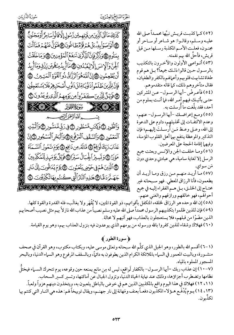 أقسم الله بالطور، وهو الجبل الذي كلَّم الله سبحانه وتعالى موسى عليه، وبكتاب مكتوب، وهو القرآن في صحف منشورة، وبالبيت المعمور في السماء بالملائكة الكرام الذين يطوفون به دائمًا، وبالسقف المرفوع وهو السماء الدنيا، وبالبحر المسجور المملوء بالمياه.