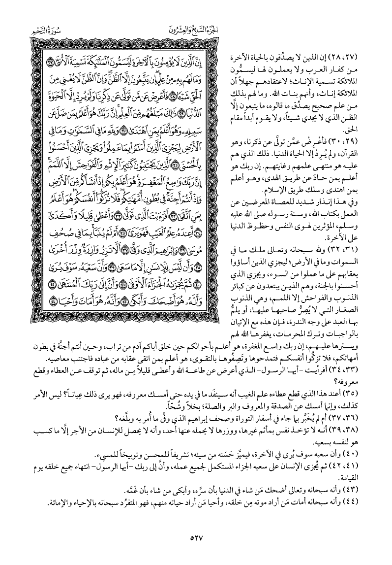 ولله سبحانه وتعالى ملك ما في السموات وما في الأرض؛ ليجزي الذين أساءوا بعقابهم على ما عملوا من السوء، ويجزي الذي أحسنوا بالجنة، وهم الذين يبتعدون عن كبائر الذنوب والفواحش إلا اللمم، وهي الذنوب الصغار التي لا يُصِرُّ صاحبها عليها، أو يلمُّ بها العبد على وجه الندرة، فإن هذه مع الإتيان بالواجبات وترك المحرمات، يغفرها الله لهم ويسترها عليهم، إن ربك واسع المغفرة، هو أعلم بأحوالكم حين خلق أباكم آدم من تراب، وحين أنتم أجنَّة في بطون أمهاتكم، فلا تزكُّوا أنفسكم فتمدحوها وتَصِفُوها بالتقوى، هو أعلم بمن اتقى عقابه فاجتنب معاصيه من عباده.