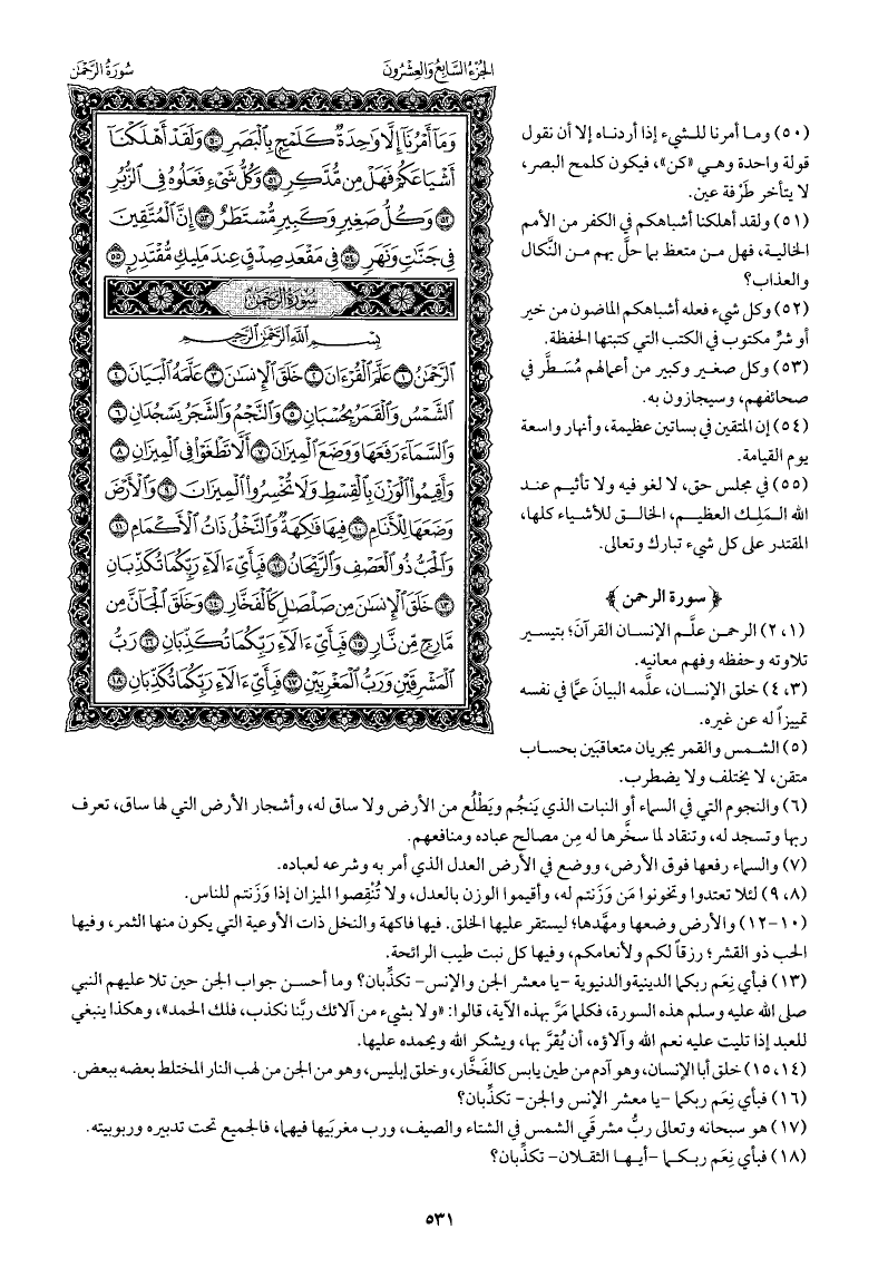 فبأي نِعَم ربكما الدينية والدنيوية -يا معشر الجن والإنس- تكذِّبان؟ وما أحسن جواب الجن حين تلا عليهم النبي صلى الله عليه وسلم هذه السورة، فكلما مر بهذه الآية، قالوا: «ولا بشيء من آلائك ربَّنا نكذب، فلك الحمد» ، وهكذا ينبغي للعبد إذا تليت عليه نعم الله وآلاؤه، أن يُقرَّ بها، ويشكر الله ويحمده عليها.