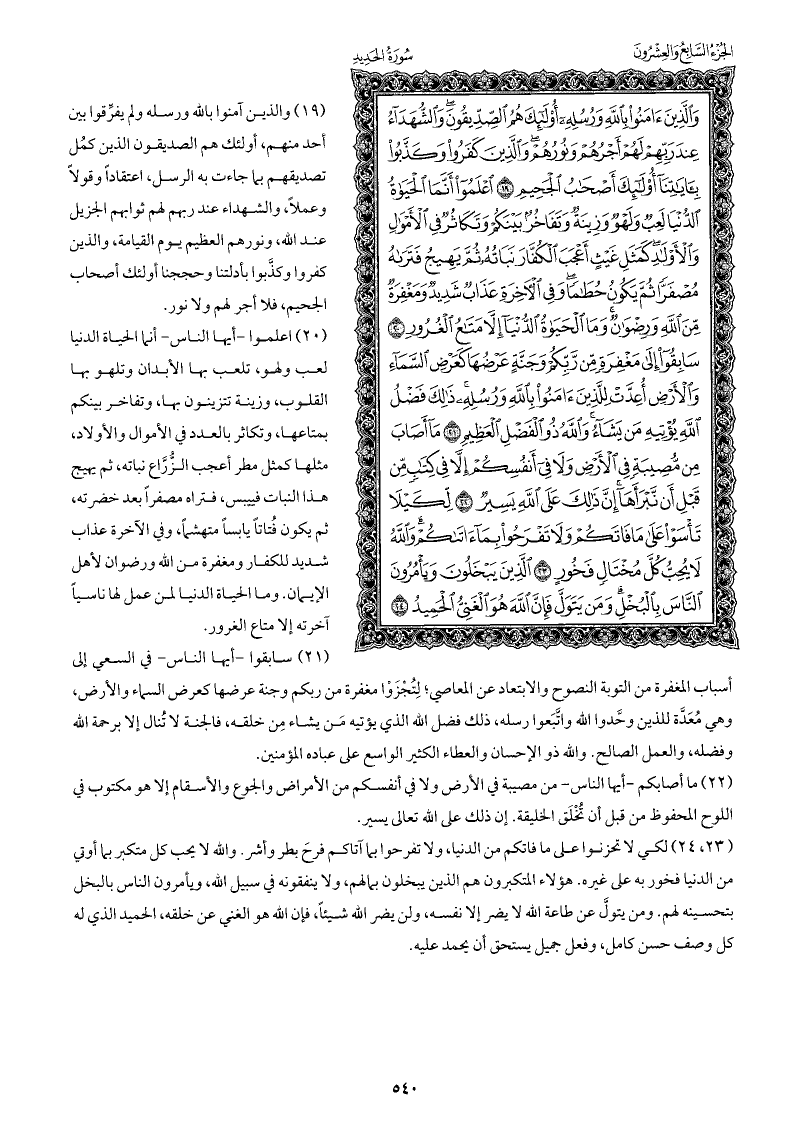 لكي لا تحزنوا على ما فاتكم من الدنيا، ولا تفرحوا بما آتاكم فرحَ بطر وأشر. والله لا يحب كل متكبر بما أوتي من الدنيا فخور به على غيره. هؤلاء المتكبرون هم الذين يبخلون بمالهم، ولا ينفقونه في سبيل الله، ويأمرون الناس بالبخل بتحسينه لهم. ومن يتولَّ عن طاعة الله لا يضر إلا نفسه، ولن يضر الله شيئًا، فإن الله هو الغني عن خلقه، الحميد الذي له كل وصف حسن كامل، وفعل جميل يستحق أن يحمد عليه.