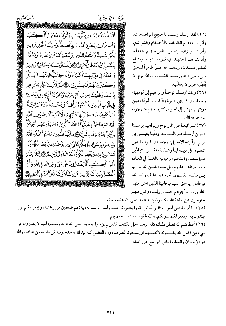 لقد أرسلنا رسلنا بالحجج الواضحات، وأنزلنا معهم الكتاب بالأحكام والشرائع، وأنزلنا الميزان؛ ليتعامل الناس بينهم بالعدل، وأنزلنا لهم الحديد، فيه قوة شديدة، ومنافع للناس متعددة، وليعلم الله علمًا ظاهرًا للخلق من ينصر دينه ورسله بالغيب. إن الله قوي لا يُقْهَر، عزيز لا يغالَب.