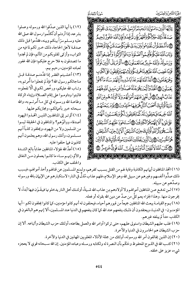 يا أيها الذين صدَّقوا الله ورسوله وعملوا بشرعه، إذا أردتم أن تُكلِّموا رسول الله صلى الله عليه وسلم سرًّا بينكم وبينه، فقدِّموا قبل ذلك صدقة لأهل الحاجة، ذلك خير لكم لما فيه من الثواب، وأزكى لقلوبكم من المآثم، فإن لم تجدوا ما تتصدقون به فلا حرج عليكم؛ فإن الله غفور لعباده المؤمنين، رحيم بهم.