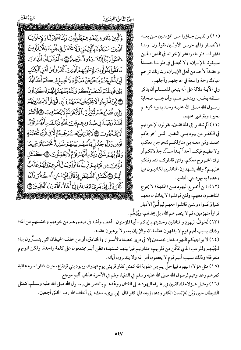 ألم تنظر إلى المنافقين، يقولون لإخوانهم في الكفر من يهود بني النضير: لئن أخرجكم محمد ومَن معه مِن منازلكم لنخرجن معكم، ولا نطيع فيكم أحدًا أبدًا سألَنا خِذْلانكم أو ترك الخروج معكم، ولئن قاتلوكم لنعاوننكم عليهم؟ والله يشهد إن المنافقين لكاذبون فيما وعدوا به يهود بني النضير.