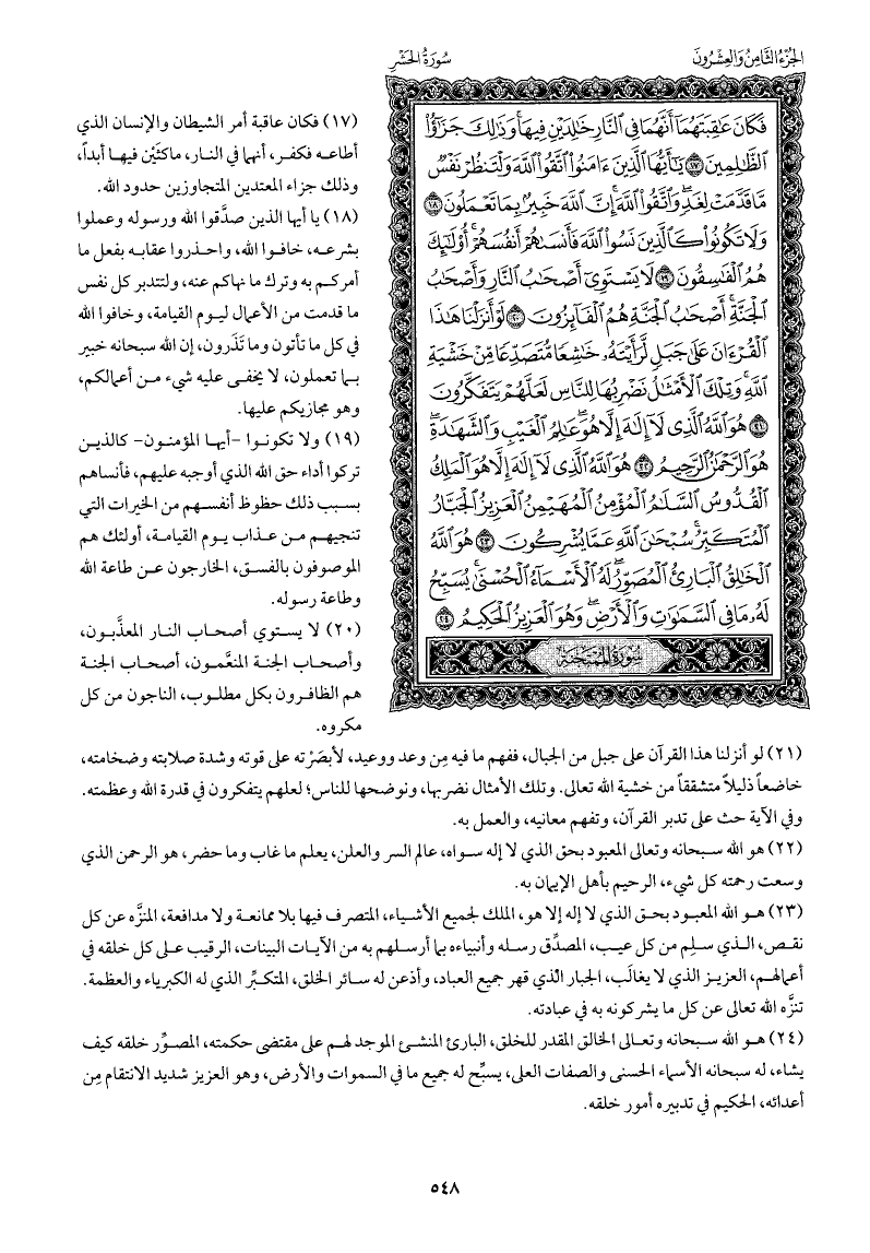 هو الله المعبود بحق، الذي لا إله إلا هو، الملك لجميع الأشياء، المتصرف فيها بلا ممانعة ولا مدافعة، المنزَّه عن كل نقص، الذي سلِم من كل عيب، المصدِّق رسله وأنبياءه بما أرسلهم به من الآيات البينات، الرقيب على كل خلقه في أعمالهم، العزيز الذي لا يغالَب، الجبار الذي قهر جميع العباد، وأذعن له سائر الخلق، المتكبِّر الذي له الكبرياء والعظمة. تنزَّه الله تعالى عن كل ما يشركونه به في عبادته.