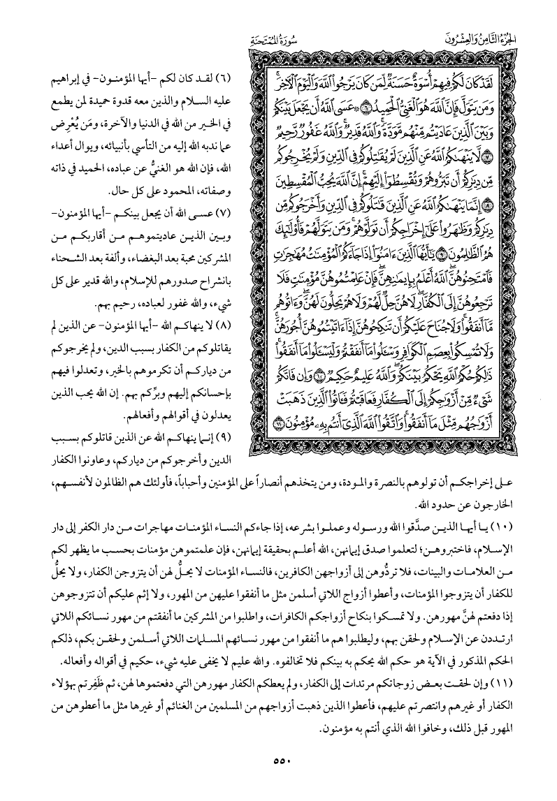 يا أيها الذين صدَّقوا الله ورسوله وعملوا بشرعه، إذا جاءكم النساء المؤمنات مهاجرات من دار الكفر إلى دار الإسلام، فاختبروهن؛ لتعلموا صدق إيمانهن، الله أعلم بحقيقة إيمانهن، فإن علمتموهن مؤمنات بحسب ما يظهر لكم من العلامات والبينات، فلا تردُّوهن إلى أزواجهن الكافرين، فالنساء المؤمنات لا يحلُّ لهن أن يتزوجن الكفار، ولا يحلُّ للكفار أن يتزوجوا المؤمنات، وأعطوا أزواج اللاتي أسلمن مثل ما أنفقوا عليهن من المهور، ولا إثم عليكم أن تتزوجوهن إذا دفعتم لهنَّ مهورهن. ولا تمسكوا بنكاح أزواجكم الكافرات، واطلبوا من المشركين ما أنفقتم من مهور نسائكم اللاتي ارتددن عن الإسلام ولحقن بهم، وليطلبوا هم ما أنفقوا من مهور نسائهم المسلمات اللاتي أسلمن ولحقن بكم، ذلكم الحكم المذكور في الآية هو حكم الله يحكم به بينكم فلا تخالفوه. والله عليم لا يخفى عليه شيء، حكيم في أقواله وأفعاله.