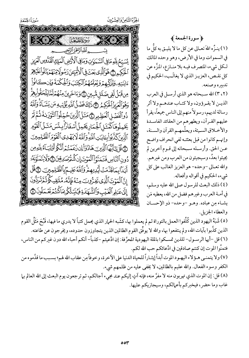 الله سبحانه هو الذي أرسل في العرب الذين لا يقرؤون، ولا كتاب عندهم ولا أثر رسالة لديهم، رسولا منهم إلى الناس جميعًا، يقرأ عليهم القرآن، ويطهرهم من العقائد الفاسدة والأخلاق السيئة، ويعلِّمهم القرآن والسنة، وإنهم كانوا من قبل بعثته لفي انحراف واضح عن الحق. وأرسله سبحانه إلى قوم آخرين لم يجيئوا بعدُ، وسيجيئون من العرب ومن غيرهم. والله تعالى -وحده- هو العزيز الغالب على كل شيء، الحكيم في أقواله وأفعاله.