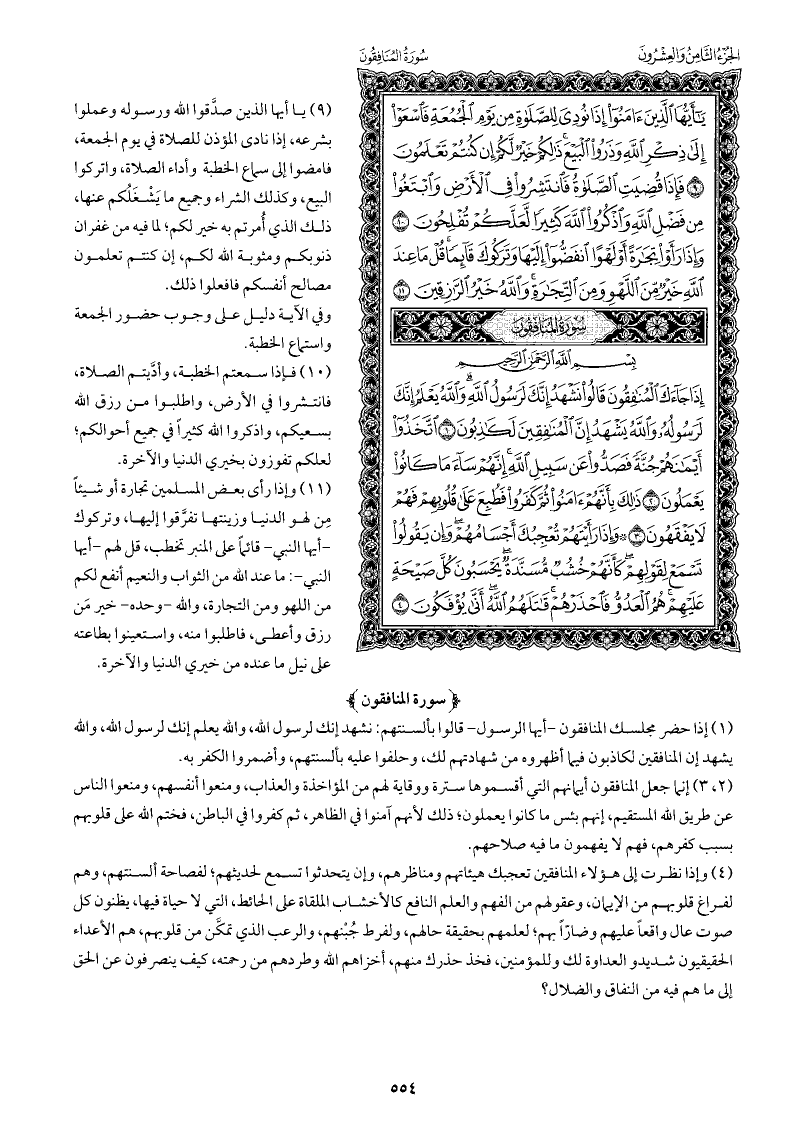 يا أيها الذين صدَّقوا الله ورسوله وعملوا بشرعه، إذا نادى المؤذن للصلاة في يوم الجمعة، فامضوا إلى سماع الخطبة وأداء الصلاة، واتركوا البيع، وكذلك الشراء وجميع ما يَشْغَلُكم عنها، ذلك الذي أُمرتم به خير لكم؛ لما فيه من غفران ذنوبكم ومثوبة الله لكم، إن كنتم تعلمون مصالح أنفسكم فافعلوا ذلك.