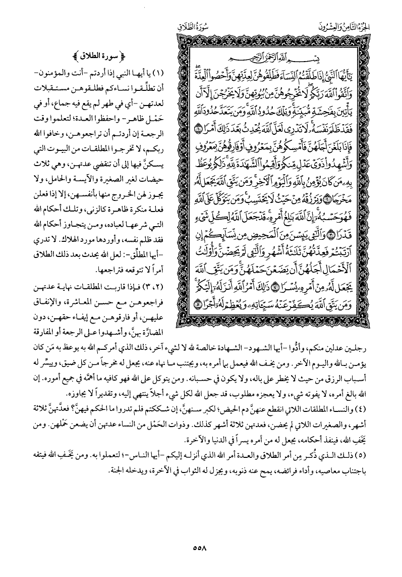 يا أيها النبي إذا أردتم -أنت والمؤمنون- أن تطلِّقوا نساءكم فطلقوهن مستقبلات لعدتهن -أي في طهر لم يقع فيه جماع، أو في حَمْل ظاهر- واحفظوا العدة؛ لتعلموا وقت الرجعة إن أردتم أن تراجعوهن، وخافوا الله ربكم، لا تخرجوا المطلقات من البيوت التي يسكنَّ فيها إلى أن تنقضي عدتهن، وهي ثلاث حيضات لغير الصغيرة والآيسة والحامل، ولا يجوز لهن الخروج منها بأنفسهن، إلا إذا فعلن فعلة منكرة ظاهرة كالزنى، وتلك أحكام الله التي شرعها لعباده، ومن يتجاوز أحكام الله فقد ظلم نفسه، وأوردها مورد الهلاك. لا تدري -أيها المطلِّق-: لعل الله يحدث بعد ذلك الطلاق أمرًا لا تتوقعه فتراجعها.