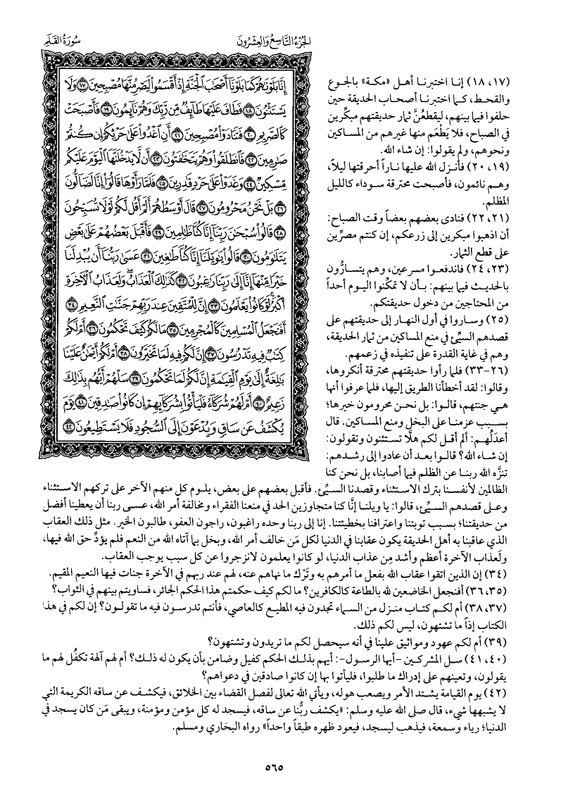 إنا اختبرنا أهل «مكة» بالجوع والقحط، كما اختبرنا أصحاب الحديقة حين حلفوا فيما بينهم، ليقطعُنَّ ثمار حديقتهم مبكِّرين في الصباح، فلا يَطْعَم منها غيرهم من المساكين ونحوهم، ولم يقولوا: إن شاء الله.