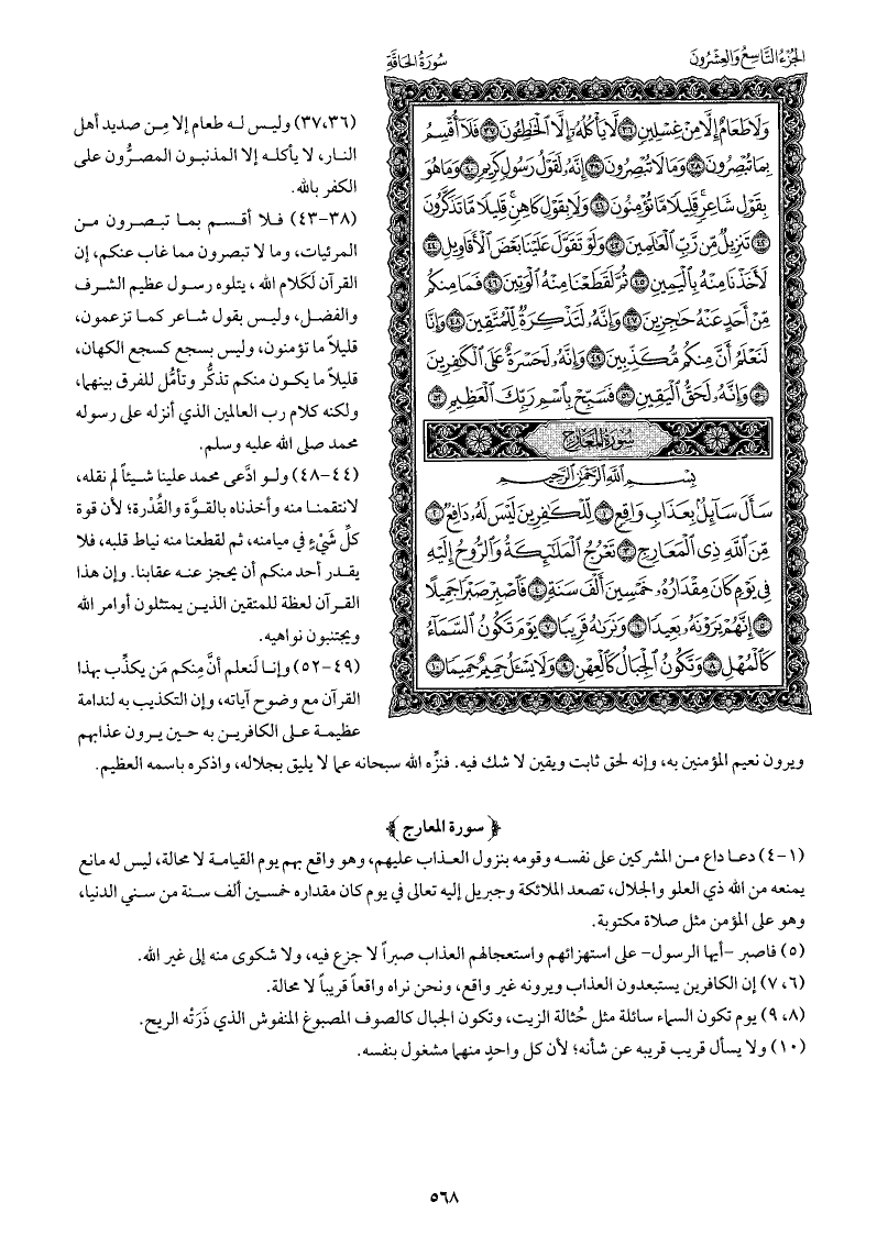 دعا داع من المشركين على نفسه وقومه بنزول العذاب عليهم، وهو واقع بهم يوم القيامة لا محالة، ليس له مانع يمنعه من الله ذي العلو والجلال، تصعد الملائكة وجبريل إليه تعالى في يوم كان مقداره خمسين ألف سنة من سني الدنيا، وهو على المؤمن مثل صلاة مكتوبة.