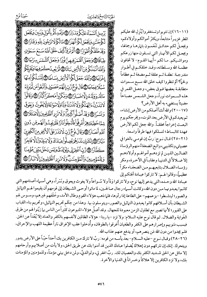 قال نوح: ربِّ إن قومي بالغوا في عصياني وتكذيبي، واتبع الضعفاء منهم الرؤساء الضالين الذين لم تزدهم أموالهم وأولادهم إلا ضلالا في الدنيا وعقابًا في الآخرة، ومكر رؤساء الضلال بتابعيهم من الضعفاء مكرًا عظيمًا، وقالوا لهم: لا تتركوا عبادة آلهتكم إلى عبادة الله وحده، التي يدعو إليها نوح، ولا تتركوا وَدًّا ولا سُواعًا ولا يغوث ويعوق ونَسْرا، وهي أسماء أصنامهم التي كانوا يعبدونها من دون الله، وكانت أسماء رجال صالحين، لما ماتوا أوحى الشيطان إلى قومهم أن يقيموا لهم التماثيل والصور; لينشطوا -بزعمهم- على الطاعة إذا رأوها، فلما ذهب هؤلاء القوم وطال الأمد، وخَلَفهم غيرهم، وسوس لهم الشيطان بأن أسلافهم كانوا يعبدون التماثيل والصور، ويتوسلون بها، وهذا من حكم تحريم التماثيل، وتحريم بناء القباب على القبور; لأنها تصير مع تطاول الزمن معبودة للجهال. وقد أضلَّ هؤلاء المتبوعون كثيرًا من الناس بما زيَّنوا لهم من طرق الغَواية والضلال. ثم قال نوح -عليه السلام-: ولا تزد -يا ربنا- هؤلاء الظالمين لأنفسهم بالكفر والعناد إلا بُعْدا عن الحق. فبسبب ذنوبهم وإصرارهم على الكفر والطغيان أُغرقوا بالطوفان، وأُدخلوا عقب الإغراق نارًا عظيمة اللهب والإحراق، فلم يجدوا من دون الله مَن ينصرهم، أو يدفع عنهم عذاب الله.