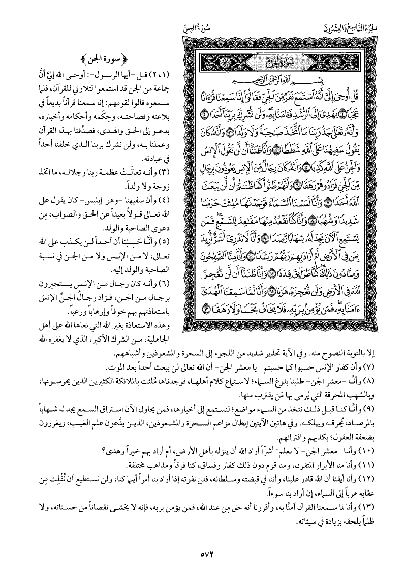 قل -أيها الرسول-: أوحى الله إليَّ أنَّ جماعة من الجن قد استمعوا لتلاوتي للقرآن، فلما سمعوه قالوا لقومهم: إنا سمعنا قرآنًا بديعًا في بلاغته وفصاحته وحكمه وأحكامه وأخباره، يدعو إلى الحق والهدى، فصدَّقنا بهذا القرآن وعملنا به، ولن نشرك بربنا الذي خلقنا أحدًا في عبادته.