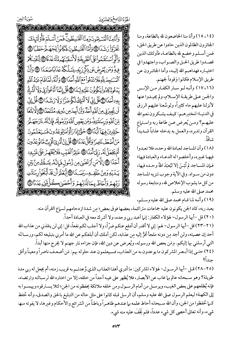 وأنه لما قام محمد صلى الله عليه وسلم، يعبد ربه، كاد الجن يكونون عليه جماعات متراكمة، بعضها فوق بعض ; مِن شدة ازدحامهم لسماع القرآن منه.