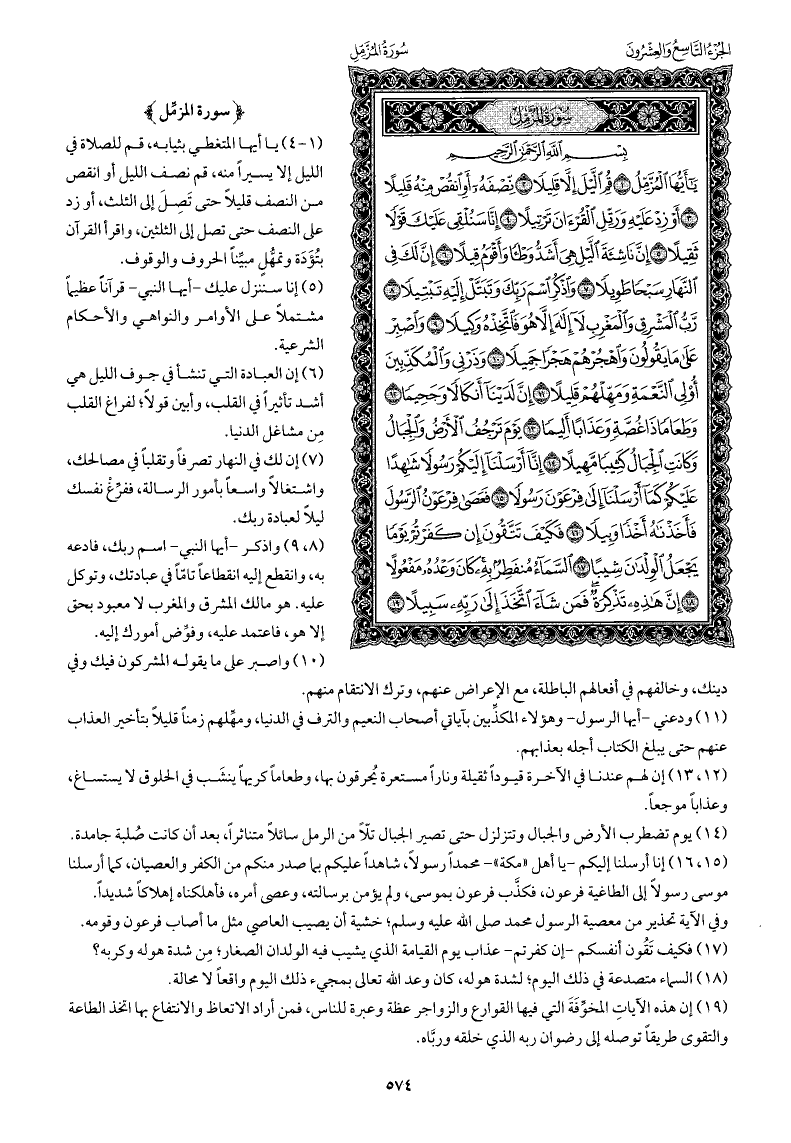 يا أيها المتغطي بثيابه، قم للصلاة في الليل إلا يسيرًا منه. قم نصف الليل أو انقص من النصف قليلا حتى تَصِلَ إلى الثلث، أو زد على النصف حتى تصل إلى الثلثين، واقرأ القرآن بتُؤَدَة وتمهُّلٍ مبيِّنًا الحروف والوقوف.