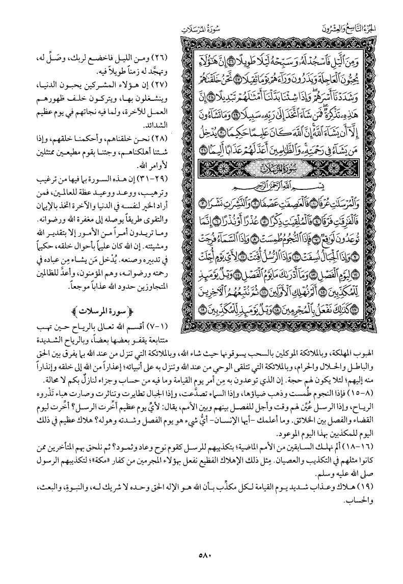 أقسم الله تعالى بالرياح حين تهب متتابعة يقفو بعضها بعضًا، وبالرياح الشديدة الهبوب المهلكة، وبالملائكة الموكلين بالسحب يسوقونها حيث شاء الله، وبالملائكة التي تنزل من عند الله بما يفرق بين الحق والباطل والحلال والحرام، وبالملائكة التي تتلقى الوحي من عند الله وتنزل به على أنبيائه; إعذارًا من الله إلى خلقه وإنذارًا منه إليهم ; لئلا يكون لهم حجة. إن الذي توعدون به مِن أمر يوم القيامة وما فيه من حساب وجزاء لنازلٌ بكم لا محالة.