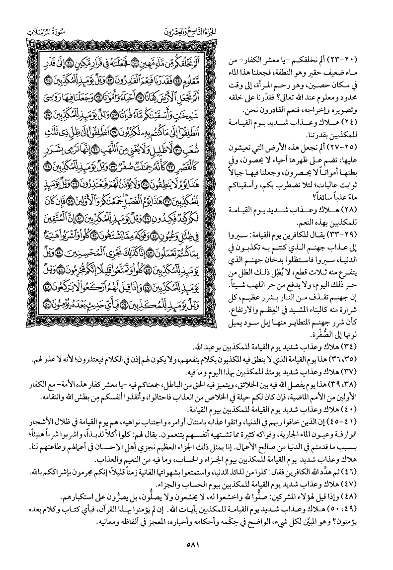يقال للكافرين يوم القيامة: سيروا إلى عذاب جهنم الذي كنتم به تكذبون في الدنيا، سيروا، فاستظلوا بدخان جهنم الذي يتفرع منه ثلاث قطع، لا يُظِل ذلك الظل من حر ذلك اليوم، ولا يدفع من حر اللهب شيئًا. إن جهنم تقذف من النار بشرر عظيم، كل شرارة منه كالبناء المشيد في العِظم والارتفاع. كأن شرر جهنم المتطاير منها إبل سود يميل لونها إلى الصُّفْرة.