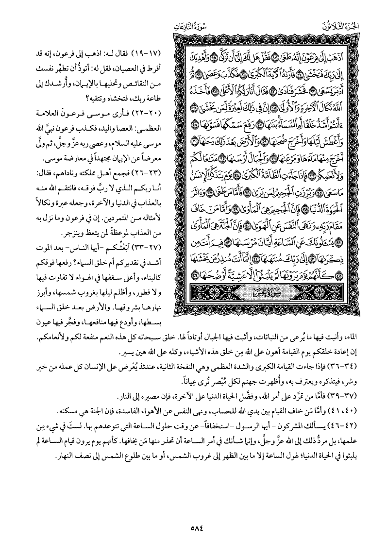 يسألك المشركون أيها الرسول -استخفافاً- عن وقت حلول الساعة التي تتوعدهم بها. لستَ في شيء مِن علمها، بل مرد ذلك إلى الله عز وجل، وإنما شأنك في أمر الساعة أن تحذر منها مَن يخافها. كأنهم يوم يرون قيام الساعة لم يلبثوا في الحياة الدنيا؛ لهول الساعة إلا ما بين الظهر إلى غروب الشمس، أو ما بين طلوع الشمس إلى نصف النهار.