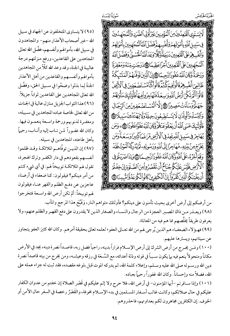 لا يتساوى المتخلفون عن الجهاد في سبيل الله -غير أصحاب الأعذار منهم- والمجاهدون في سبيل الله، بأموالهم وأنفسهم، فضَّل الله تعالى المجاهدين على القاعدين، ورفع منزلتهم درجة عالية في الجنة، وقد وعد الله كلا من المجاهدين بأموالهم وأنفسهم والقاعدين من أهل الأعذار الجنة لِما بذلوا وضحَّوا في سبيل الحق، وفضَّل الله تعالى المجاهدين على القاعدين ثوابًا جزيلا.