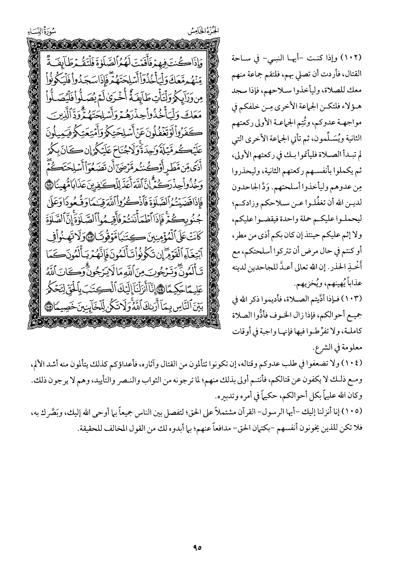 وإذا كنت -أيها النبي- في ساحة القتال، فأردت أن تصلي بهم، فلتقم جماعة منهم معك للصلاة، وليأخذوا سلاحهم، فإذا سجد هؤلاء فلتكن الجماعة الأخرى من خلفكم في مواجهة عدوكم، وتتم الجماعة الأولى ركعتهم الثانية ويُسلِّمون، ثم تأتي الجماعة الأخرى التي لم تبدأ الصلاة فليأتموا بك في ركعتهم الأولى، ثم يكملوا بأنفسهم ركعتهم الثانية، وليحذروا مِن عدوهم وليأخذوا أسلحتهم. ودَّ الجاحدون لدين الله أن تغفُلوا عن سلاحكم وزادكم; ليحملوا عليكم حملة واحلة فيقضوا عليكم، ولا إثم عليكم حينئذ إن كان بكم أذى من مطر، أو كنتم في حال مرض، أن تتركوا أسلحتكم، مع أخذ الحذر. إن الله تعالى أعدَّ للجاحدين لدينه عذابًا يهينهم، ويخزيهم.